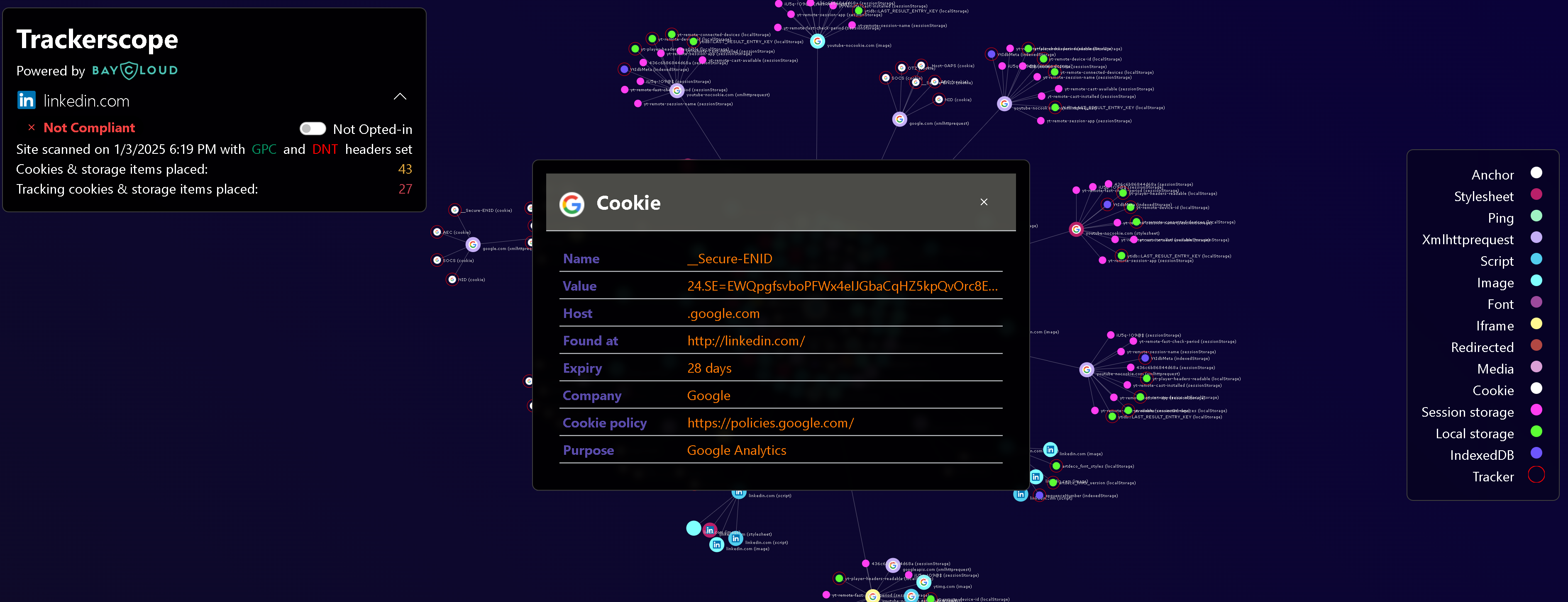 Detailed website cookie scanning, with example categorisations
